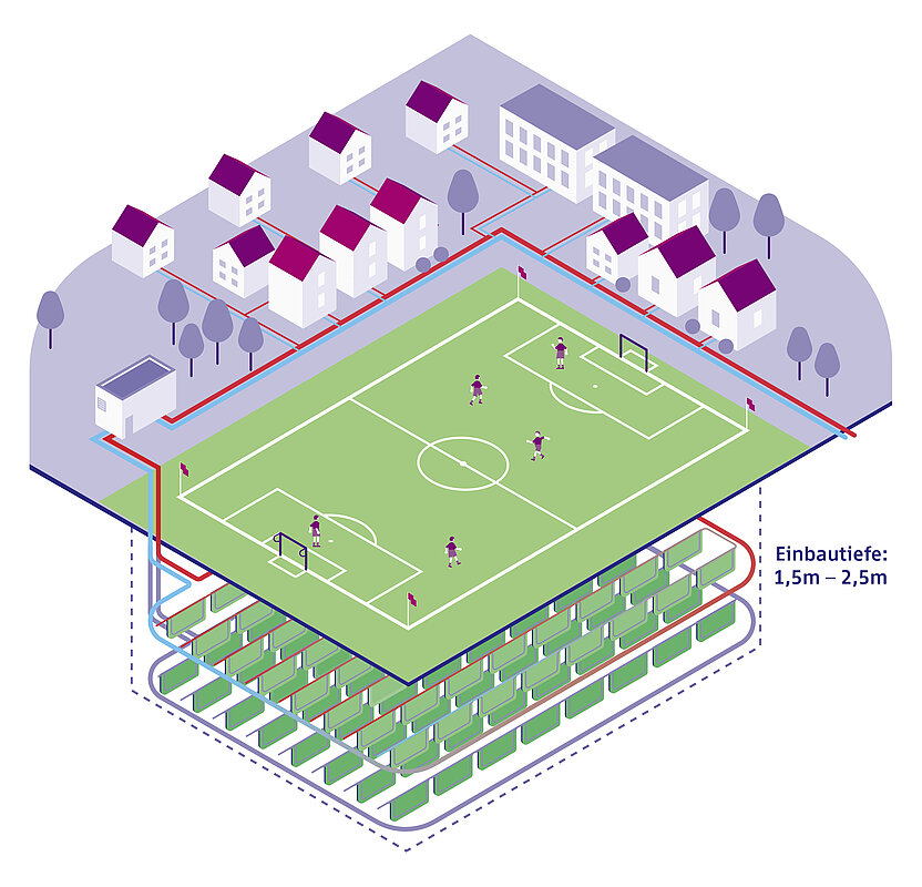 Doch neue und bestehende Sport- oder Bolzplätze kosten nicht nur Geld, sie bringen jetzt auch welches ein. Und zwar indem sie Umweltenergie liefern, die Gebäude klimafreundlich und zukunftsfähig heizt und kühlt. Die gewonnene Wärme kann man zudem in Wärmenetze einspeisen. So lassen sich auch weiter entfernte Gebäude von Gas und Heizöl auf eine effiziente Sole-Wärmepumpe umrüsten.