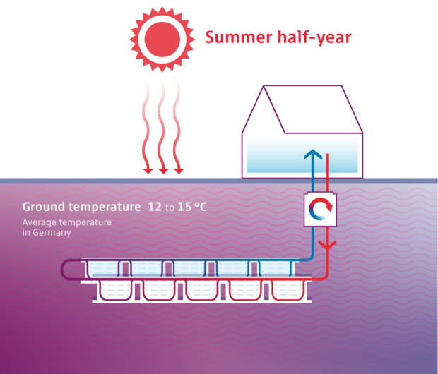 At temperate latitudes, the soil is regenerated in the cycle of the seasons. In summer, the sun supplies approx. 1,000 kWh per square metre of soil. During the heating period, the GeoCollect system is able to harvest around 20 to 25 percent of this energy, i.e. between 200 and 250 kWh per square metre of unsealed land.